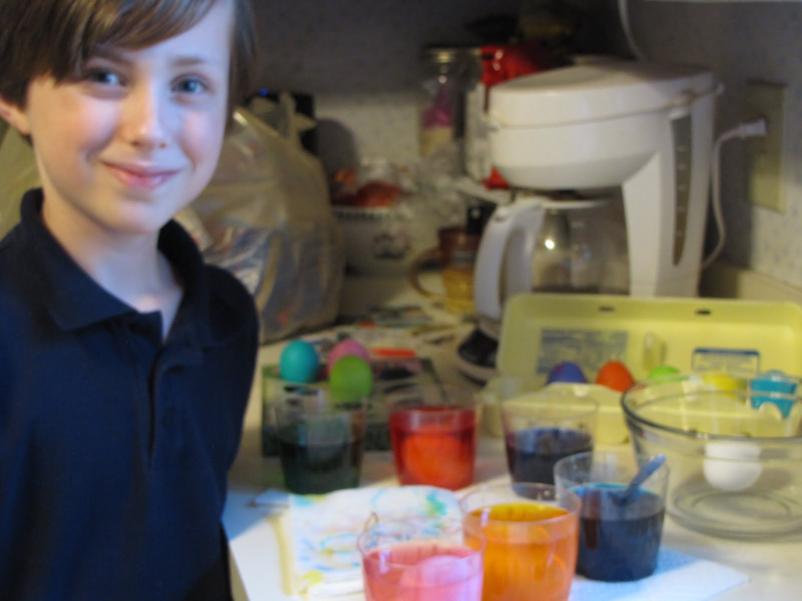 Dying eggs for Easter is always about so much more than the eggs themselves! This year, the paper towel we used for blotting the egg dipper became a work of art. And Little Charlie produced "The Egg Show," a running commentary of the process of dying eggs complete with egg jokes and puns: Have you red the directions? If not, you'll be blue, and that's no yolk!
